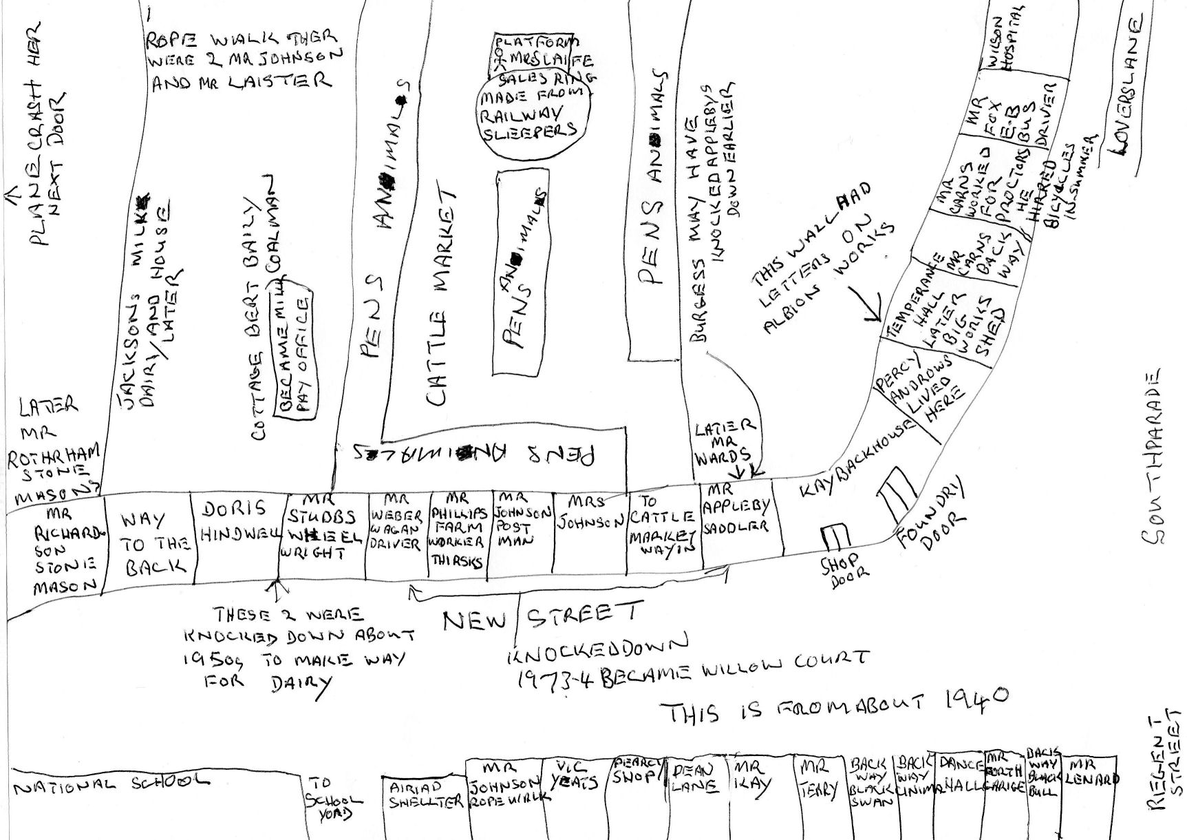 This map is of the corner of New Street and South Parade to show the location of the old Albion Foundry and was drawn by a Pocklington resident, completely from his own recollections of living in the town all of his life.