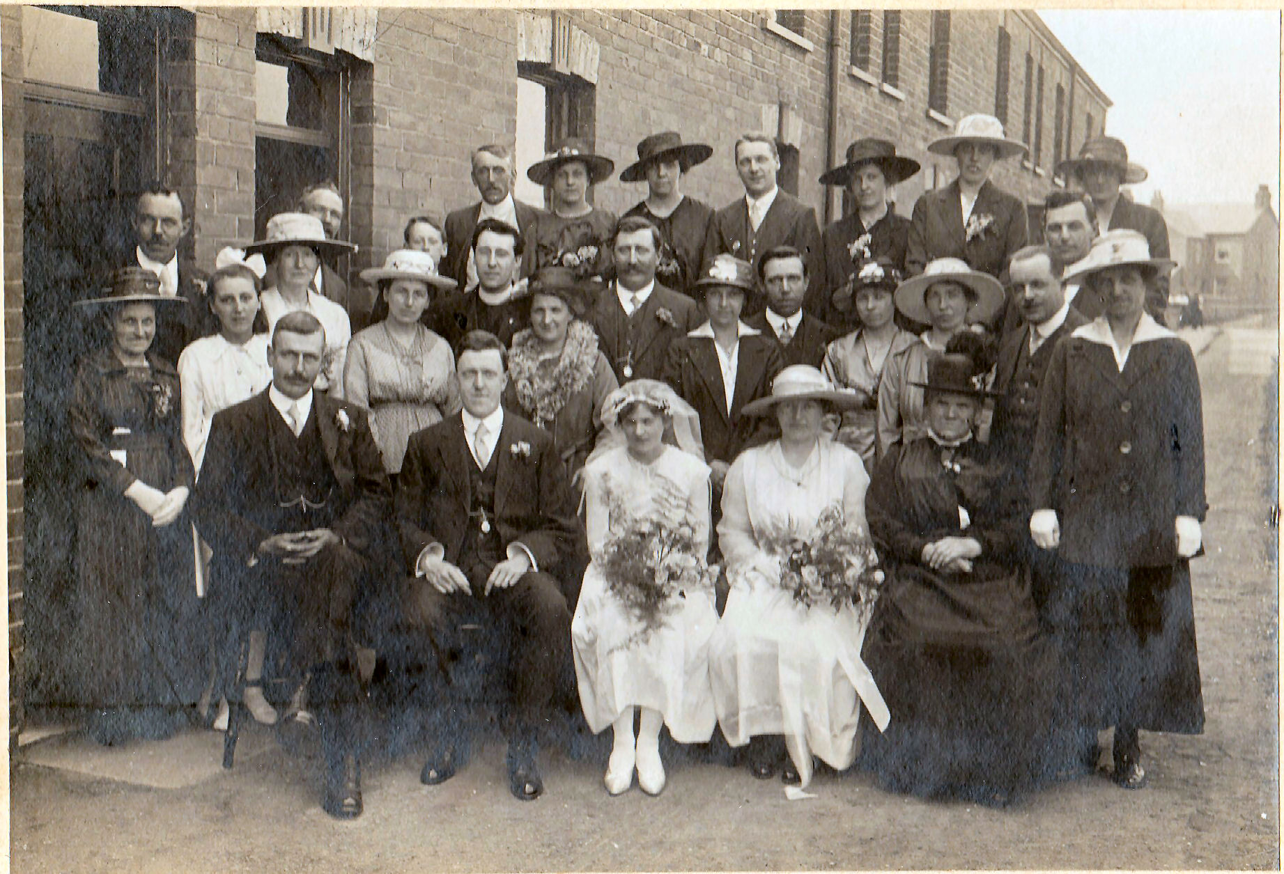 A group wedding photo taken outside Alma Terrace, Kirkland Street, Pocklington between Victoria May Snow and Evelyn Leonard Thornham -- a drainage clerk of Pocklington -- in 1919. Alfred and Hannah Hanley is 2nd and 3rd from right second row --but for many years he has sought to discover the identifty of the man standing behind Alfred. Can anyone help? An email from Ken Hanley thinks his grandmother is on the photo (Florence Hanley nee Walker) the 3rd from the left on the back row.