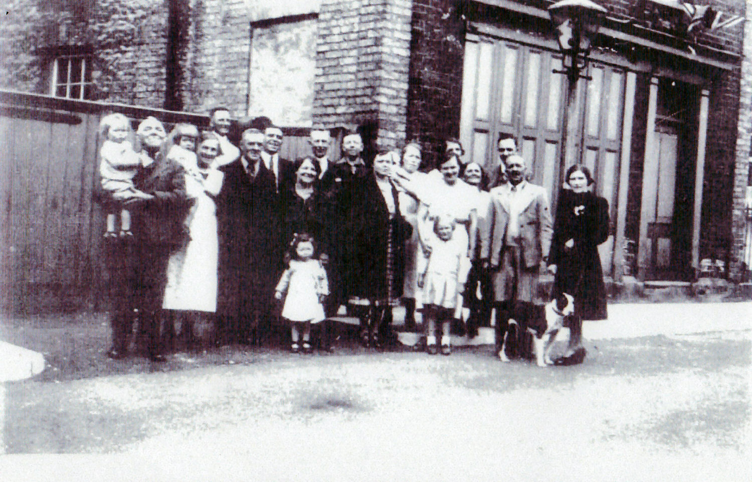 | This is Mary Conrey Harrison's lodging house in Union Street in about 1942. She lived to be 100, and these are some of her family . Note the street gas lamp . Residents relates the tale about 'kicking' on the post to switch them on. If this did not work then they had a little ladder which they climbed up and re-lit the pilot light, or changed the mantle. Clare Evans is mother to Lilly and tells the tale how she got free Cinema tickets from Mr Grant. |