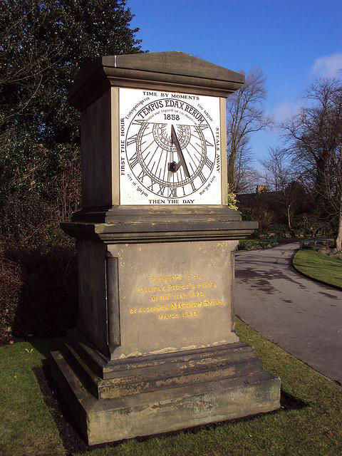 The memoir contains another significant reference to JS's skill as a sundial maker. A few years after he moved to Spaldington his landlord, Sir Henry Vavasour, decided to build a school. JS offered to make a sundial to stand in front of the school and the offer was accepted, but although made it was never erected due to the estate changing hands. Some years later it was bought by a Halifax alderman and presented to the committee of the Peoples Park of that town, where it was erected and stands to this day. I contacted the Halifax archives and was passed on to Deborah Comyn-Platt of Calderdale Council Community Services Directorate. She is administering a heritage lottery grant awarded to refurbish the park, including the sundial. At the time of producing this second edition the sundial work is part completed and should be finished soon.
