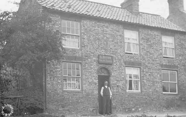 That's George Brown, Tailor and Draper of Bishop Wilton. He is standing under his sign at the entrance to a passageway that separated a dwelling on the left from his double-fronted dwelling on the right. Notice how the sign is slightly offset to his side of the passageway. The downstairs room on the far right, without curtains or a blind in the window, was where he did his tailoring. This particular postcard was sent by George Brown's wife to their daughter. But for the postmark on the back it would have been unidentifiable.