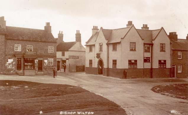 A busy corner with The Fleece Inn, two shops, some inhabitants and a dog. The shop over the road from The Fleece is the Pocklington and District Industrial (?) Co-operative Society, and the one along the road from The Fleece is the newspaper shop and post office. |