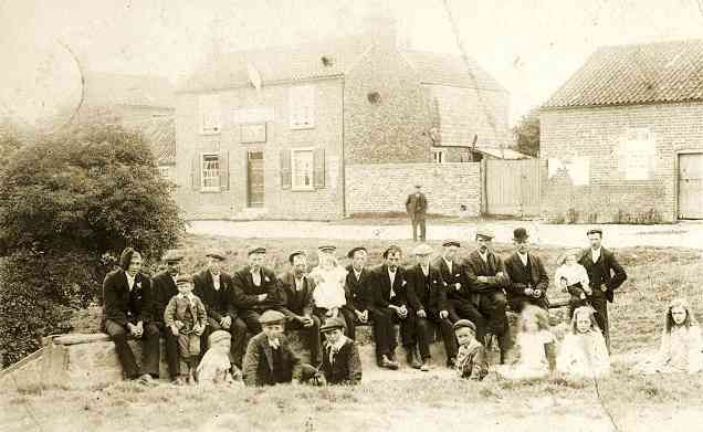 Behind the group on the bridge wall you can see the front of The Cross Keys. One of the notices on the wall to the right advertises the Pocklington Flower Show. We haven't been able to identify anyone in this photo yet or find out what the occasion was. |