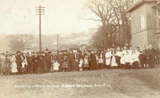 It has been said that the wife of the new vicar, Rev. Peters, didn't want to live in the old vicarage by the church and so a new vicarage was built. The next postcard in this section (out of order, sorry!) shows the laying of the foundation stone. A number of people have been identified: James Newby (second from the right); Rev. Peters in white with black cassock, hat and hands clasped in front of him; George Brown and his family (tall man, second bowler hat from the left with his family to his left). Over the heads, spot the sign post and Hall Farm buildings. |