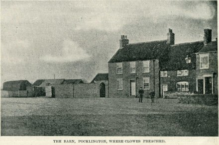 | One of the earliest Pocklington photographs. This remarkable photograph was discovered in an old Primitive Methodist Book. How do we know it is old? The farmhouse shown was extensively altered and extended to replace the cottage in the centre, to become the building we now know as the Garden Chinese Restaurant. We know it is prior to 1897 as that was the year the beck down Grape Lane was culverted (Beastfair bridge can be seen on the right of the picture). It is even older than this because there is no Wilberforce House, which according to Pevsner was built in 1867 by Thomas Grant. There seems to be no railway line, but it may not be possible to see the railway line from this angle. The methodist text gives a clue to the source of the photographs. ''Through the kindness of Rev. G. Ellis we are enabled to give views taken from old prints... of a view of a barn (long since pulled down to make way for a modern mansion) in which the night service was held, As recalling some vanished outward features, then before the eyes of Clowes and his hearers, these views are not without their interest.'' James Francis Ellis was vicar of Pocklington from 1840 until his death in 1876. Is this the barn that John Wesley held his early meetings in Pocklington? |
